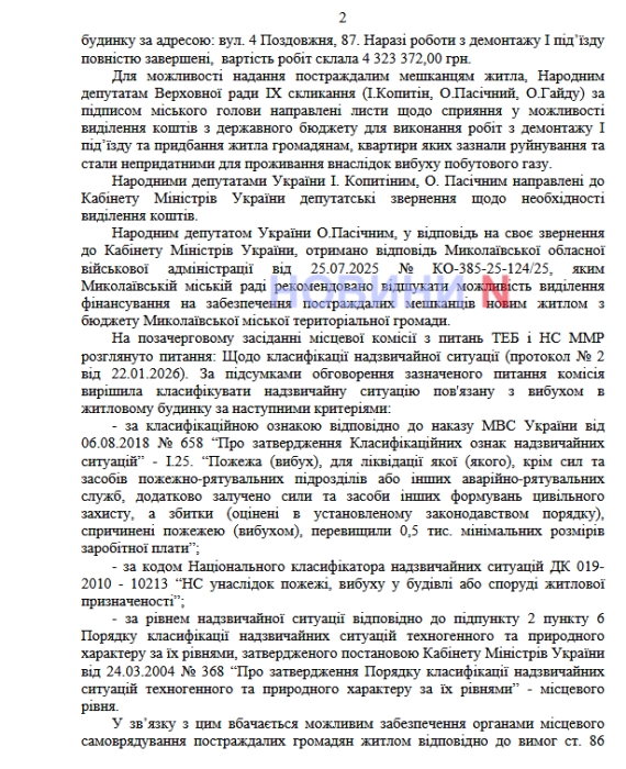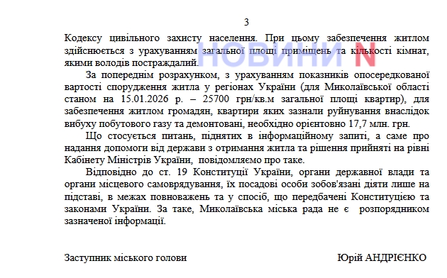 У відповіді міськради, підписаній заступником міського голови Юрієм Андрієнко, сказано, що для забезпечення постраждалих житлом народні депутати України направили звернення до Кабінету Міністрів із проханням виділити державне фінансування на придбання квартир для мешканців зруйнованого під'їзду. Також наголошується, що народний депутат Олександр Пасічний отримав відповідь на своє звернення до Кабінету Міністрів України – його надала Миколаївська обласна військова адміністрація. У документі сказано: