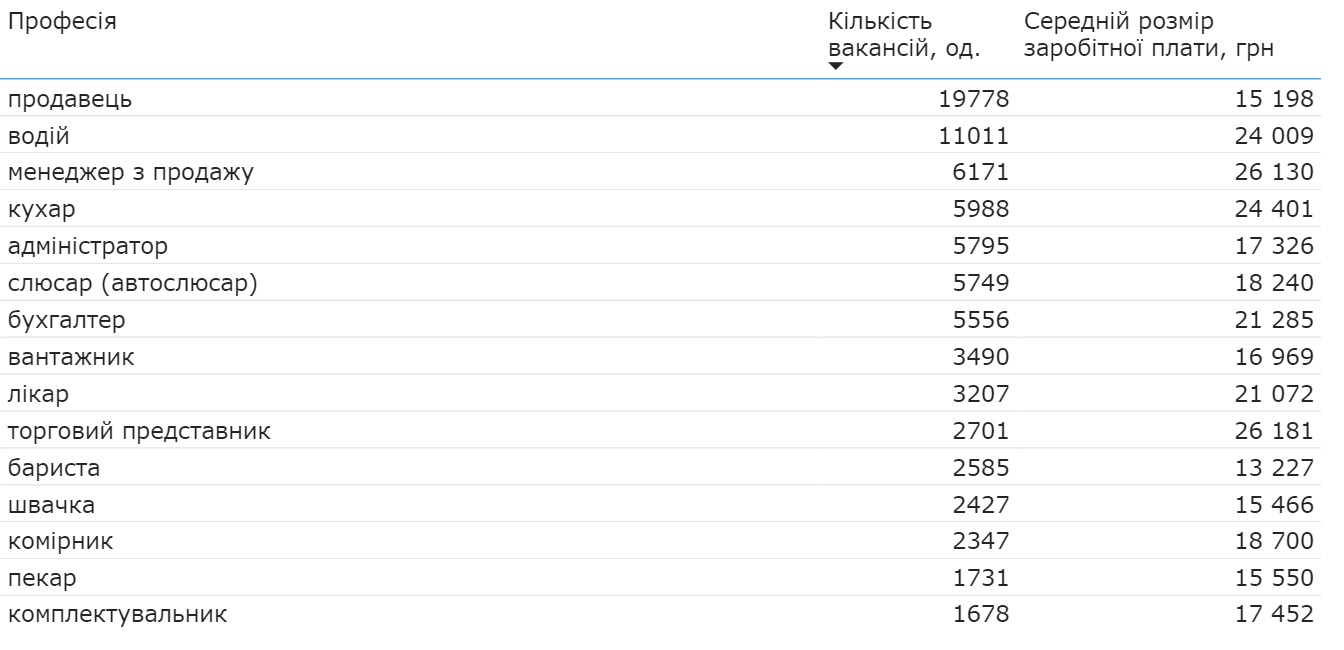Щодо рівня зарплат, першість залишається за айтівціями та топменеджерами. Водночас у сферах з найбільшою кількістю вакансій роботодавці вказують такі середні зарплати: сфера обслуговування – 18 тис. грн; робочі спеціальності, виробництво – 20,5 тис. грн; продаж, закупівля – 26,5 тис. грн; роздрібна торгівля – 16,7 тис. грн; готельно-ресторанний бізнес, туризм – 18,5 тис. грн.