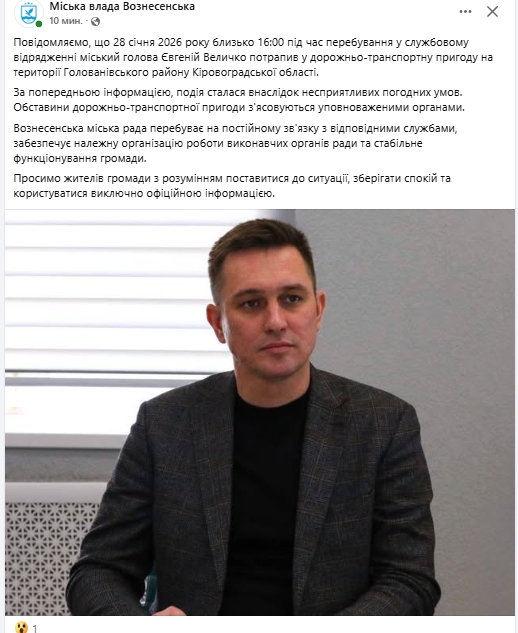 Наголошується, що приблизно о 16:00 на території Голованівського району Кіровоградської області мер Вознесенська "став учасником трагічної ДТП". За попередньою інформацією, причиною аварії стали несприятливі погодні умови. Обставини ДТП з'ясовуються уповноваженими органами. Про стан Євгена Величка зараз нічого не повідомляється.