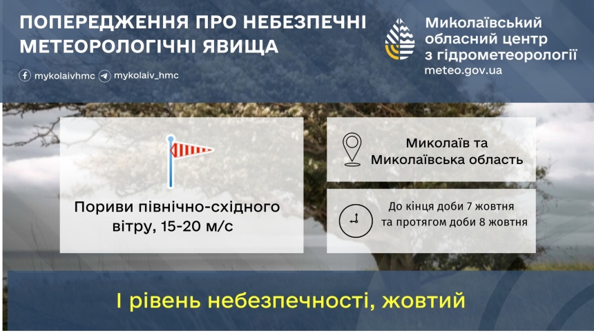 До кінця доби 7 жовтня та протягом дня 8 жовтня у Миколаєві та по всій області прогнозується посилення північно-східного вітру до 15–20 м/с.