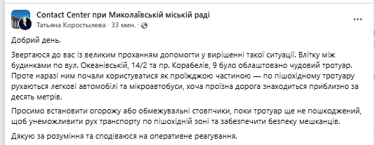 Мешканка звернулися до міської адміністрації з проханням допомогти у вирішенні проблеми на вулиці Океанівській. За її словами, влітку між будинками №14/2 та проспектом Корабелів, 9, було облаштовано новий тротуар, проте зараз ним почали користуватися як проїжджою частиною.