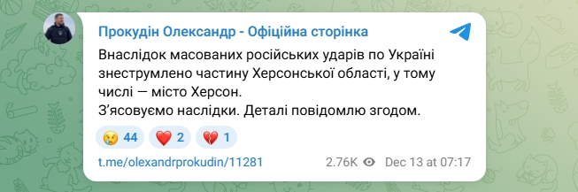 «Внаслідок російських ударів по Україні частково знеструмлено Херсонську область і саме місто Херсон. Наразі з'ясовуємо всі наслідки. Подробиці будуть пізніше», - написав Прокудін.