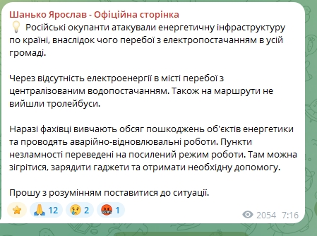 «Пункти незламності переведено на посилений режим роботи. Там можна зігрітися, зарядити гаджети та отримати необхідну допомогу», - зазначив Шанько .