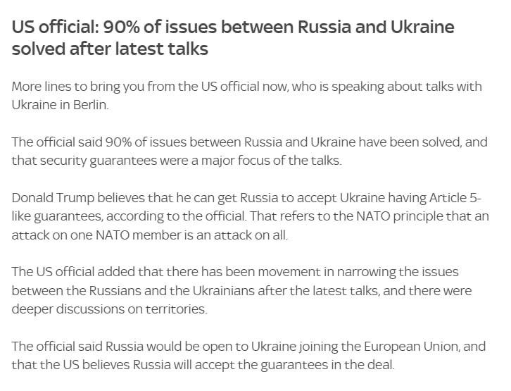 Після останніх переговорів української та американської делегацій у Берліні між Росією та Україною врегульовано близько 90% питань.