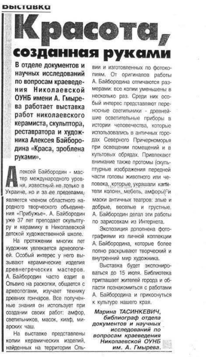 Його ольвійські світильники, лампи для олії, кіафи, міарські чаші, амфори, театральні маски були присутні на виставках декоративно-ужиткового мистецтва в місті. Останнім часом він виготовляв ще й козацькі люльки.