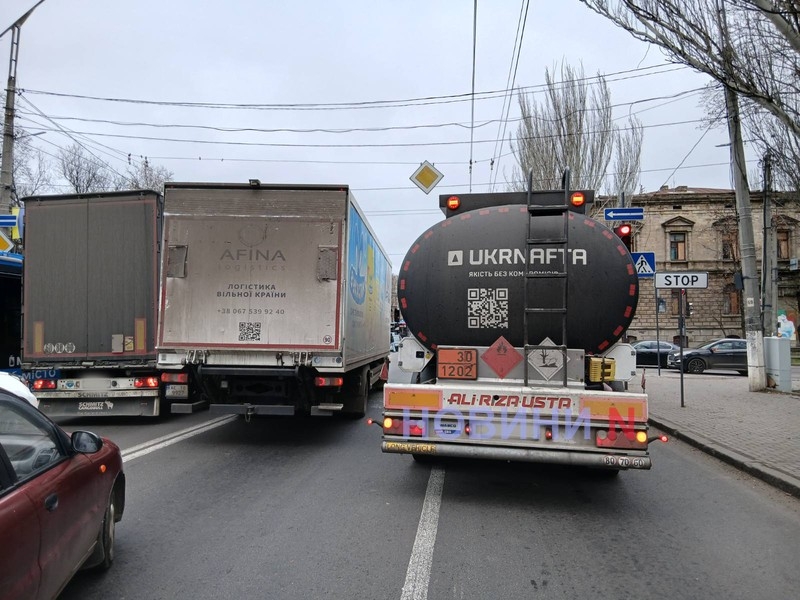 У Миколаєві на вул. Аркасівській (Пушкінській) сталися зіткнення між сідельним тягачем DAF із цистерною, легковим автомобілем Renault та вантажівкою Mercedes.