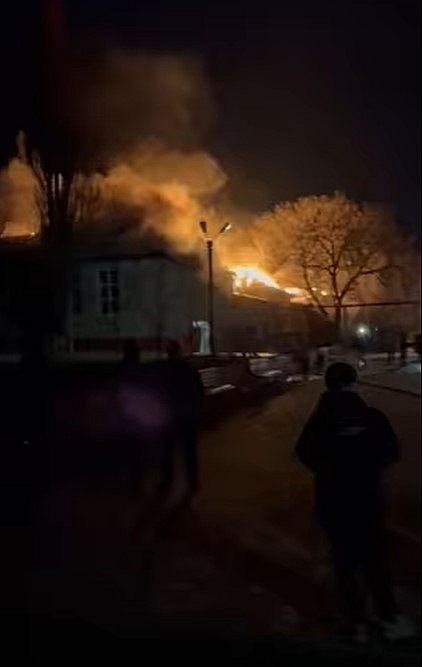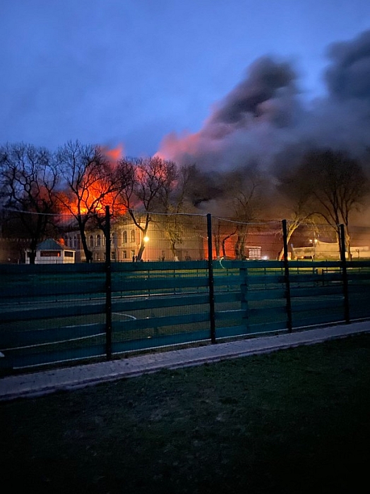 За словами коментаторів, пожежа палає у будівлі старої німецької гімназії. Вогонь вже охопив покрівлю.