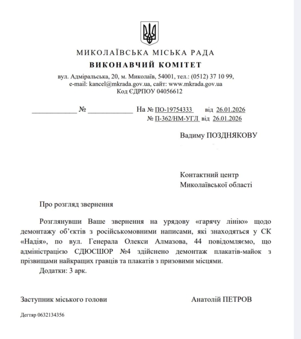 Про це йдеться в офіційній відповіді виконавчого комітету Миколаївської міської ради, повідомляє «Деколонізація. Україна».
