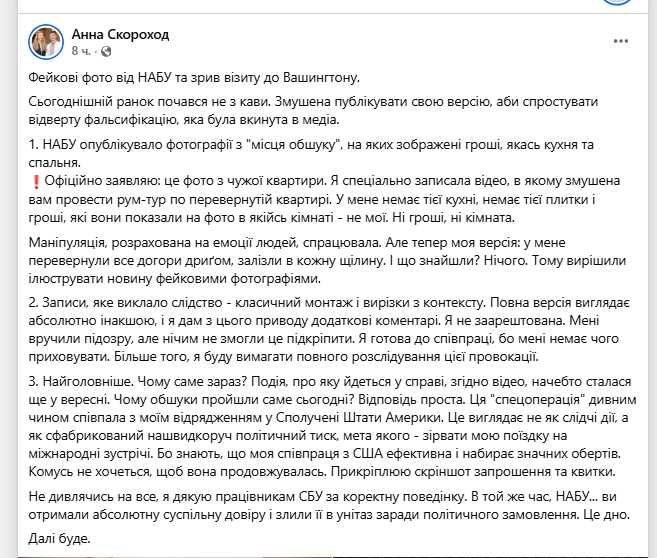 "Ця 'спецоперація' якось збіглася з моїм відрядженням у США. Це виглядає не як слідчі дії, а як фабрикація для політичного тиску, метою якої є зірвати мою поїздку. Вони знають, що моя співпраця зі США активно розвивається, і комусь не подобається, що вона продовжується", - написала вона.