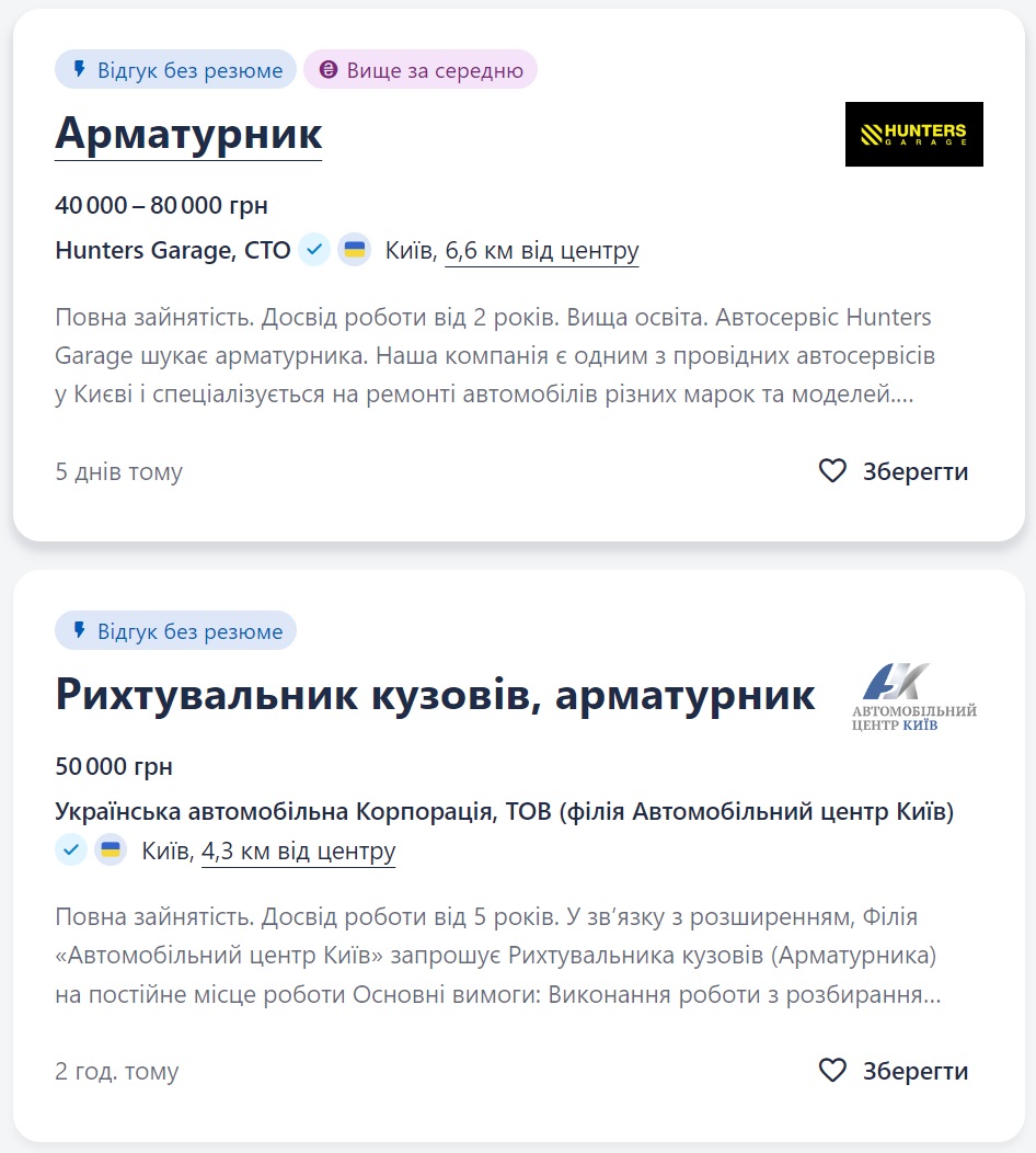 Спеціалісти з ремонту та відновлення транспортних засобів можуть заробляти 40-80 тис. грн. Такий рівень доходу пропонують за вакансією арматурника в одному з київських автосервісів.