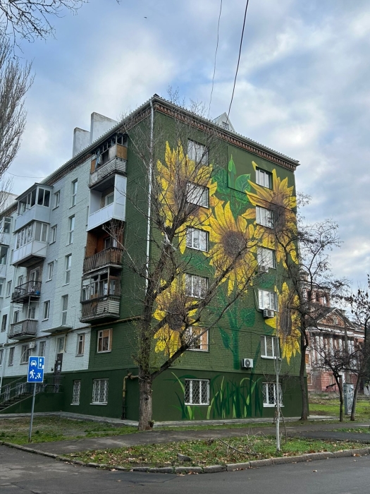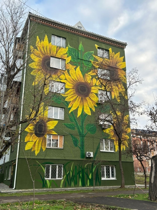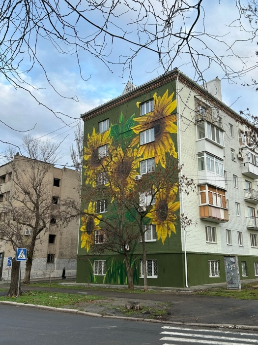 На стіні будинку, який відновили після обстрілу, намалювали величезні соняшники . Стенопис на будинку, що зазнав руйнування, говорить про пам'ять і водночас надію. Це нагадування, що навіть після випробувань місто живе, відновлюється та наповнюється новими смислами.