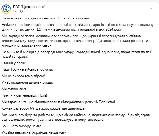 « Станції у вогні! Наші ТЕС – не військові об'єкти. Ми не виготовляємо зброю, у нас працюють громадянські люди. Ми зупинилися… Зараз нуль генерації. Нуль! Ми втратили все, що відновлювали цілодобово», — зазначається у повідомленні.