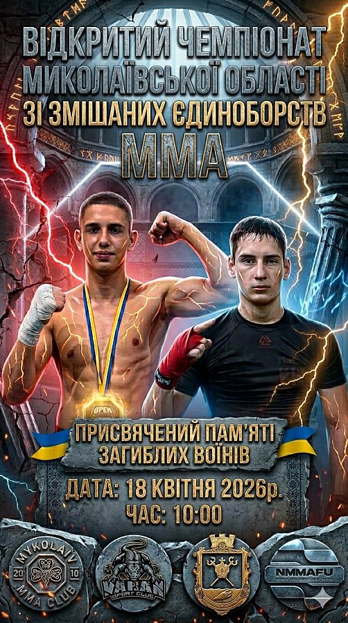 Відкритий чемпіонат Миколаївської області зі змішаних єдиноборств ММА відбудеться у суботу, 18 квітня, у спорткомплексі «Надія» .