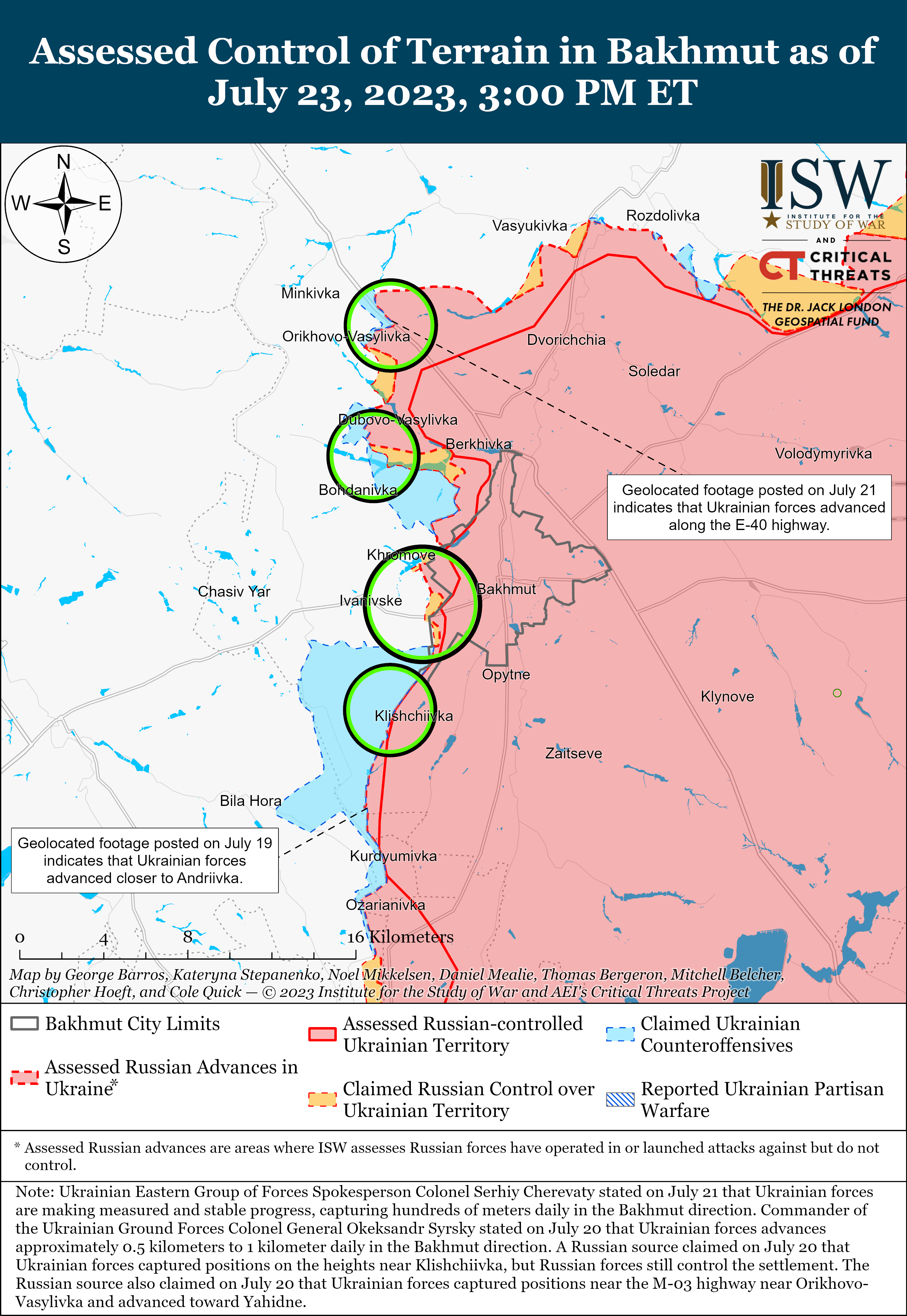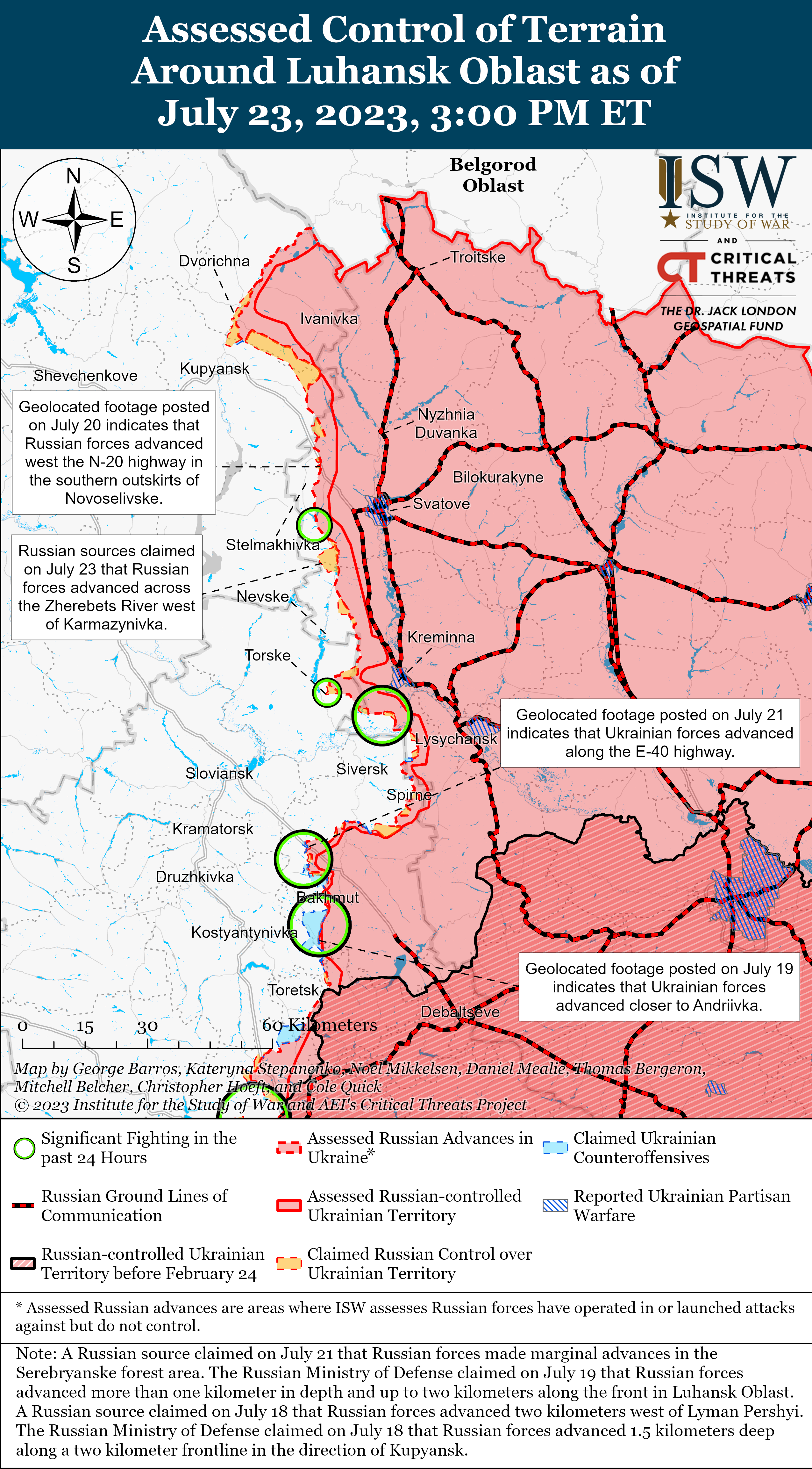 ЗСУ продовжували контрнаступальні операції в районі Бахмута і, як повідомляється, 23 липня досягли успіхів у районі міста Бахмут. Українське джерело повідомило, що Сили оборони просунулися на північний захід від Хромова (безпосередньо на захід від Бахмута), а російський "військор" стверджував, що ЗСУ відтіснили війська РФ до межі населеного пункту.