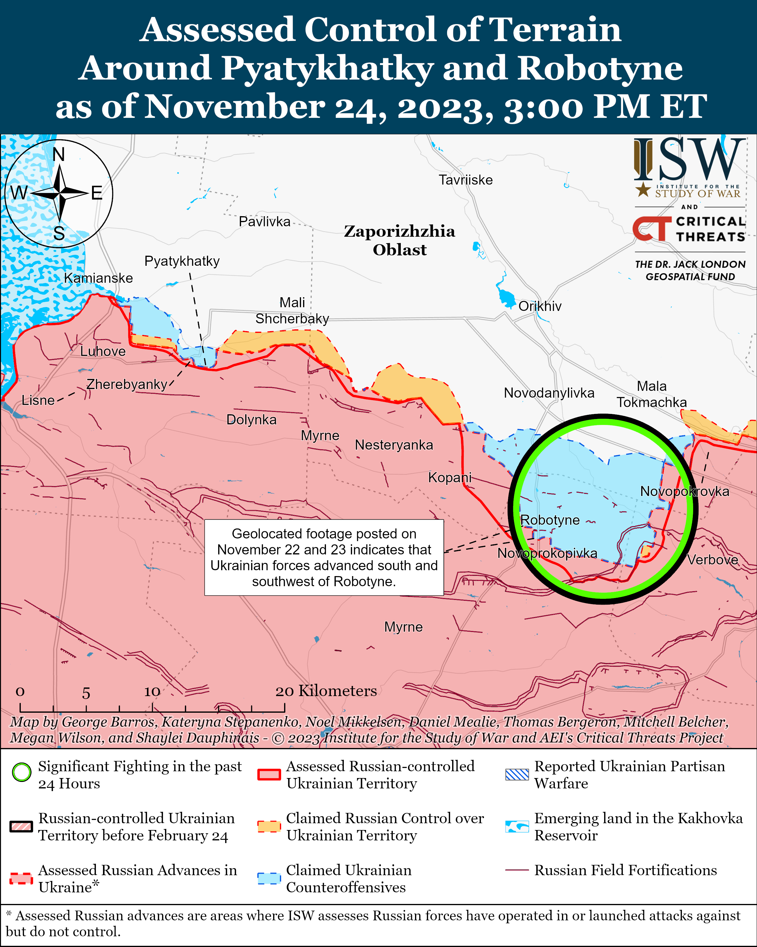 Українські війська продовжували контрнаступальні операції у західній частині Запорізької області 23 та 24 листопада та підтвердили успіхи. Відеозапис з геолокацією, опублікований 22 листопада, показує, що українські війська відбили найзахіднішу траншею в серії з трьох траншів, які розташовані приблизно за 1 км на південний захід від Роботино, а інші відеозаписи з геолокацією, опубліковані 23 листопада, показують, що українські сили також просунулися далі на захід від західної траншеї.