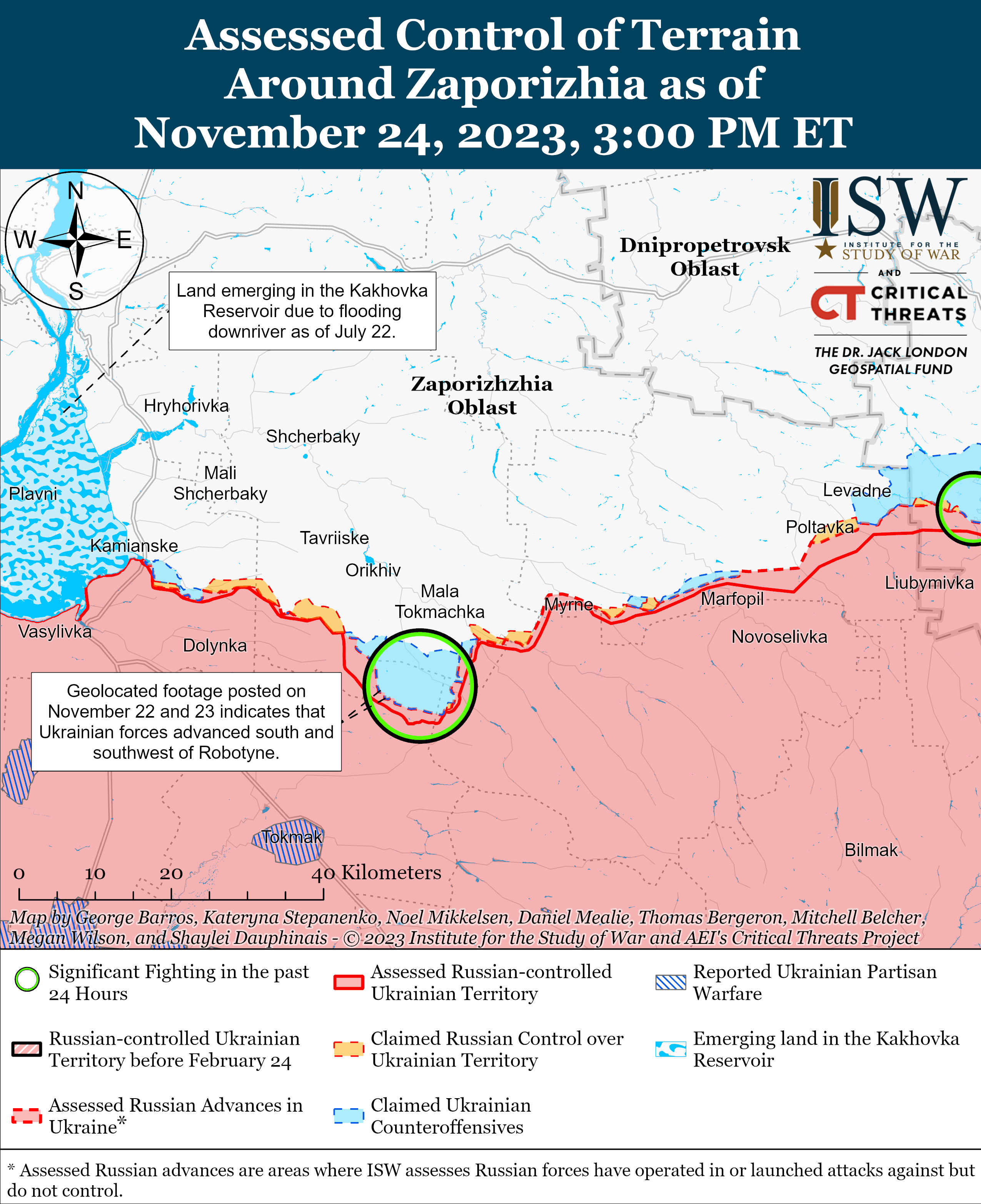 Додаткові відеозаписи з геолокацією, опубліковані 22 та 23 листопада, показують, що українські війська незначно просунулися вперед поблизу шосе Т0408 "Горіхів-Токмак" на північ від Новопрокопівки.