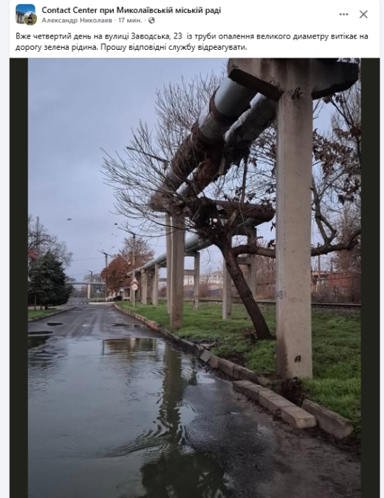Мешканці Миколаєва повідомили із труб тепломережі вже четвертий день на дорогу тече зелена рідина.
