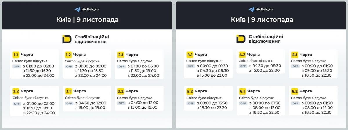 Невдовзі "ДТЕК" опублікувало в Telegram детальні графіки відключень для черг. Сумарно жителі столиці будуть без світла понад 8 годин на добу.