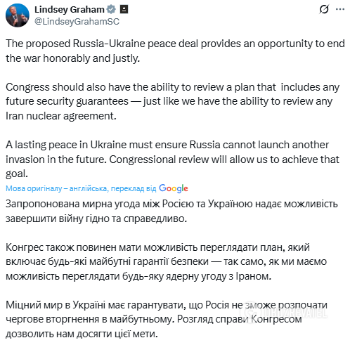 Про це в неділю, 23 листопада, заявив друг України, американський сенатор Ліндсі Грем. Представник Республіканської партії опублікував новий пост в X (Twitter), прокоментувавши активізацію дипломатичних процесів.