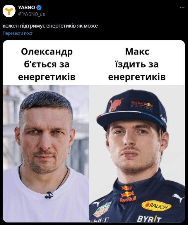І Усик, і Ферстаппен пов'язані з енергетичною сферою, правда, кожен по-різному. Компанія YASNO вирішила показати цей зв'язок у мемі, підписавши його: "Кожен підтримує енергетиків, як може".