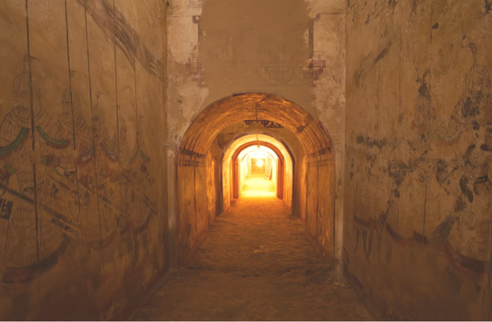 Не лише невелика цегляна гробниця була вкрита розписами — оздобленими виявили також ворота, коридор і постамент, на якому стояли труни. Куполоподібна стеля відрізняється від решти декору та містить зображення, схоже на дракона. Фігури біля входу, імовірно, зображають охоронців у жовтих мантіях із мечами, перев’язаними навколо талії.