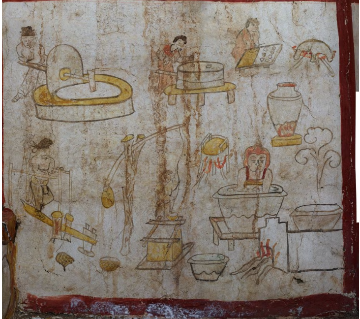 Лун Чжень, директор Науково-дослідного інституту стародавнього міста Цзіньян при Інституті захисту культурних реліквій Тайюаня, повідомив (за перекладом державного агентства «Сіньхуа»), що по обидва боки дверей гробниці намальовані парні фігури, а по всій гробниці зображені сцени з життя людей — від жінок, які штовхають каміння, щоб молоти борошно, до чоловіків, що готують локшину, жінок, які носять воду в апельсинових посудинах, і чоловіків, які товчуть рис молотами.