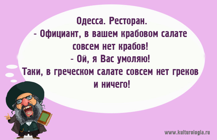 В этом выпуске одесских анекдотов вы узнаете, с чем пирожки на Привозе, что происходит с долларом, о генетическом парадоксе, почему в крабовом салате нет крабов и ещё о многом другом.