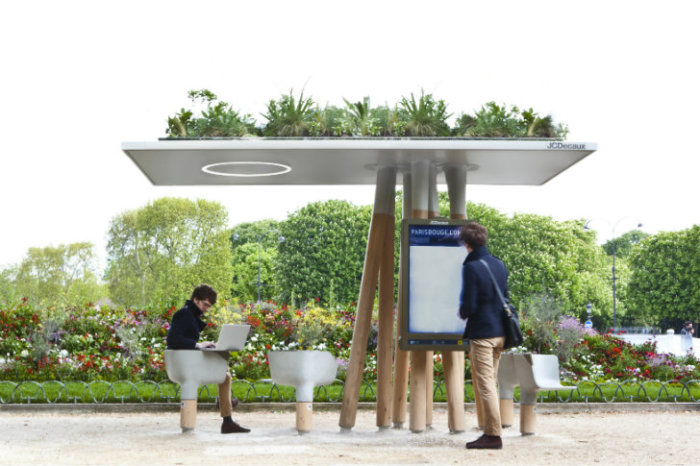 Футуристическая Wi-fi станция с комфортабельными стульями для отдыха, которая сверху выглядит, как клумба.