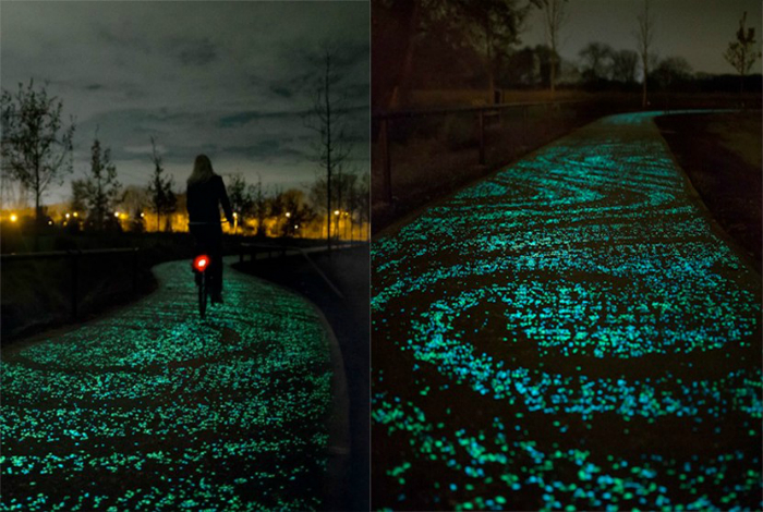 Велодорожка, которая усеяна тысячами фосфоресцирующих камушков, которые поглощают солнечную энергию днём и светятся ночью.