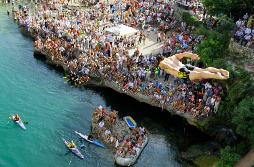 Пешеходный мост через реку Неретву в городе Мостаре представляет собой современную копию древнего моста, полностью уничтоженного хорватскими боевиками в 1993 году. Мост является объектом Всемирного наследия ЮНЕСКО. Одним из развлечений туристов и традиционным заработком молодых людей города являются прыжки в реку Неретву с центра Старого моста (высота прыжка зависит от уровня воды в реке — от 24 до 30 м).
