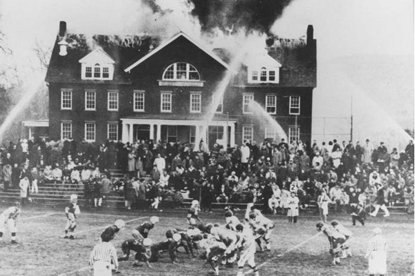 Счастливые родители наблюдают, как сыновья играют в футбол, пока здание школы полыхает на заднем плане. Подумаешь, падают с высоты горящие балки. Не обращайте внимания, дети, продолжайте играть.