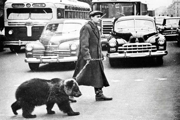 Григорий Сухов ведёт домашнего медведя Микки на прогулку по Москве. И вы ещё спрашиваете, откуда взялись все эти глупые стереотипы о русских?