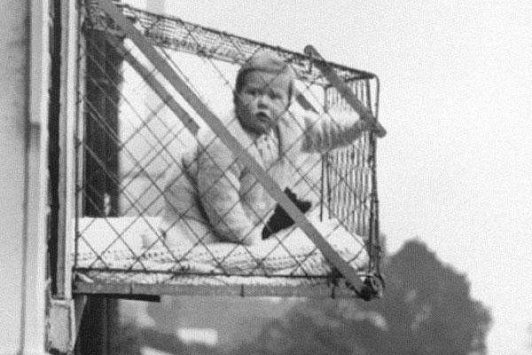 Сегодня родители в панике бегут к врачу, когда у детей насморк. А теперь представьте, что ребёнка поместили в клетку, которая еле держится снаружи здания на высоте пятого этажа. В 30-е годы это было абсолютно нормальным явлением. Приспособление пользовалось популярностью у семей, живущих в многоэтажных домах: так ребёнок мог дышать свежим воздухом.
