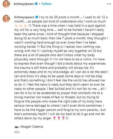 Наразі Спірс також намагається пробачити свою сім'ю, яка, за її словами, багато років чинила з нею неправильно.