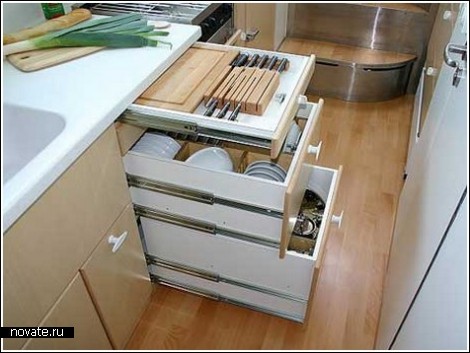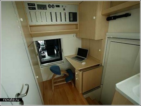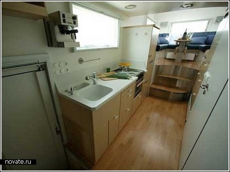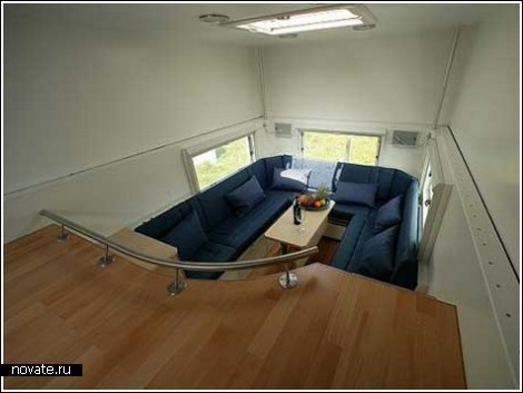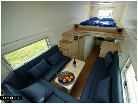 На первом этаже этого необычного дома располагается гостиная с большим мягким диваном в виде буквы П, кухня, туалет с душем, рабочее место и множество мелких и крупных шкафов, часть из которых, по совместительству, является ступеньками на которой этаж. А там находится большая двухместная кровать.