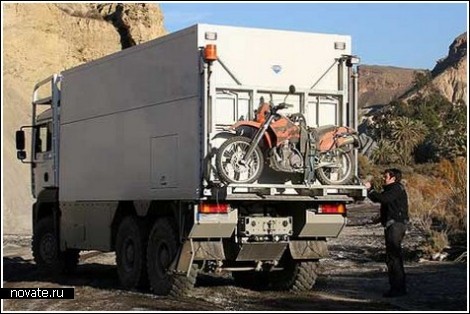 Отличительной особенностью дворца на колесах от фирмы VARIO был встроенный в него гараж для легковых автомобилей. Дом на колесах от Стивена Робертса таким шиком похвастаться не может. Но зато сзади, на бывшем мусороподъемнике, у него отлично помещается мотоцикл.