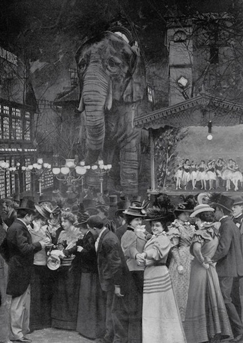 Старинные фотографии, на которых запечатлен “Мулен Руж”, сегодня могут вызвать недоумение. Отдыхающие парижане на фоне гигантского слона - это нечто сродни выдумке или умелого фотоколлажа. Хотя на самом деле слон существовал, он был куплен владельцами клуба Джозеффом Оллером и Чарльзом Зидлером на Всемирной выставке, которая проходила в 1889 году в Париже, и установлен в саду “Мулен Руж”.