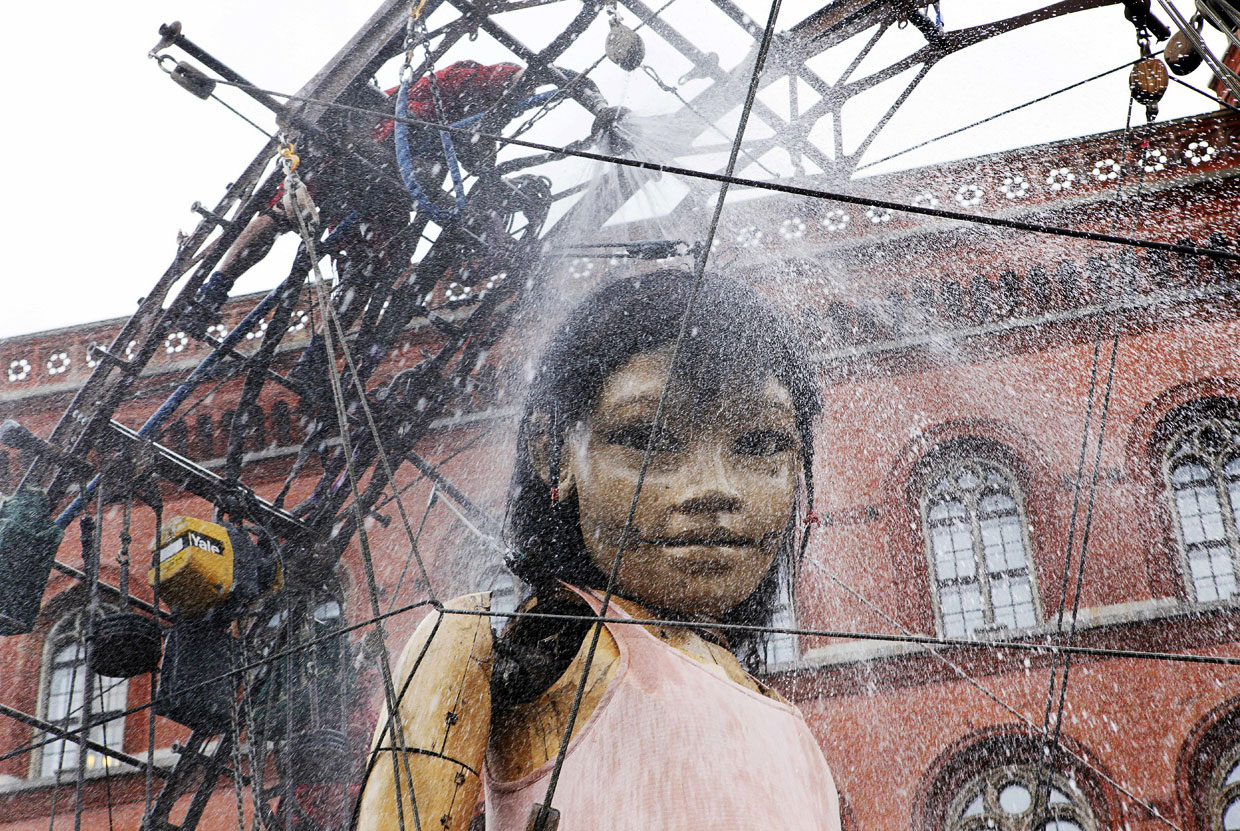 Это представление гигантских марионеток под названием «Морская одиссея» состоялось с 20 по 22 апреля 2012 в английском городе Ливерпуль. В финальной сцене участвовали 3 механические марионетки: маленькая девочка (9 метров в высоту), ее дядя в водолазном костюме (15 метров в высоту) и собака. (Фото Christopher Furlong | Getty Images):