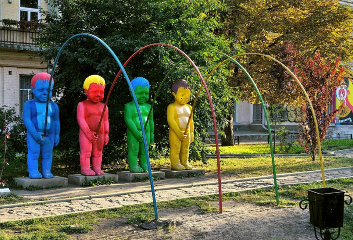 Разноцветные скульптуры писающих мальчиков.