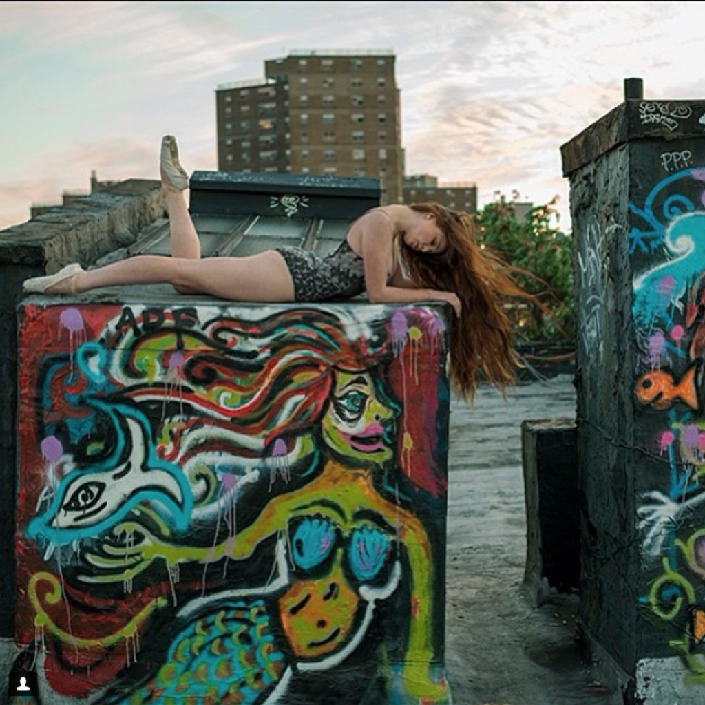 Katie Williams из American Ballet Theatre позирует на фоне видов Нью-Йорка.