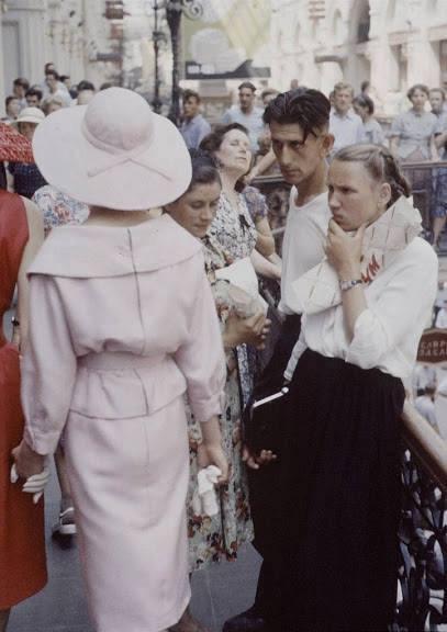 На фото видно как окружающие разглядывают француженок, как инопланетян. Да и сами иностранные модели очень выделяются на однообразном, мрачном фоне народа за «железным занавесом».
