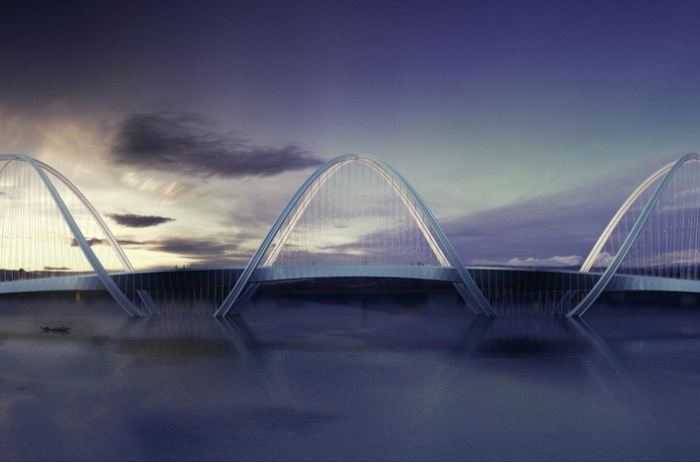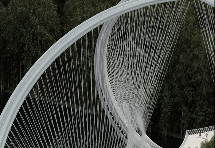 Само название моста переводится как «Три пика». Их олицетворяют опорные тросы эллиптической формы. Кроме того, конструкция будет выполнена в белом цвете, чтобы создать разительный контраст с лесистым фоном и грязной речной водой.