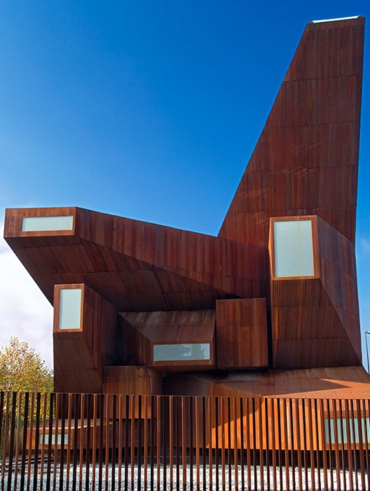 Архитектурная студия Vicens and Ramos Estudio de Arquitectura завершила работу над церковью Санта-Моника в испанском городе Ривас-Васиамадрид. Внешне строение мало чем напоминает храм Божий в традиционном понимании. С одной стороны здание выполнено в виде закругленной формы, а с фасада оно представляет собой несколько своеобразных лучей. Снаружи церковь обшита листами кортеновской стали.