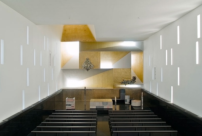 Каждый из «лучей» является своеобразным люком, который создает игру света на алтаре. Внутренний дизайн церкви более чем лаконичен. Нижняя часть пространства выполнена в черном мраморе, который создает разительный контраст с белоснежными стенами с множеством прямоугольных отверстий, сквозь который проходит свет.