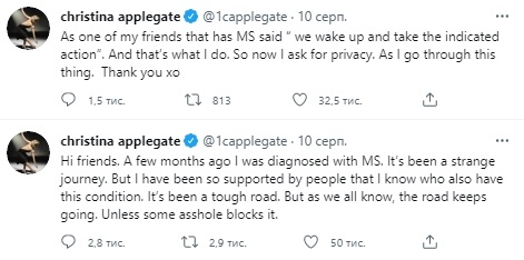 Кристина Эпплгейт уже несколько месяцев борется с рассеянным склерозом и попросила уважать ее частную жизнь.