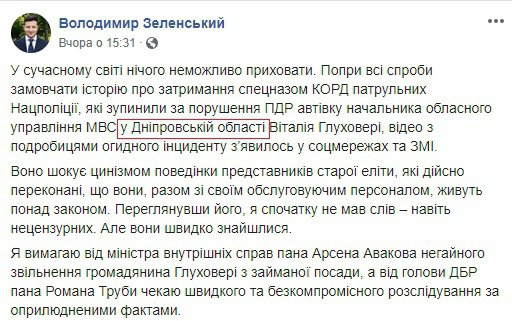 «В современном мире ничего невозможно скрыть. Несмотря на все попытки замолчать историю о задержании патрульных, которые остановили за нарушение авто начальника областного управления МВД в Днепровской области Виталия Глуховерю, видео с подробностями инцидента появилось в соцсетях и СМИ», — написал Зеленский.