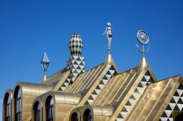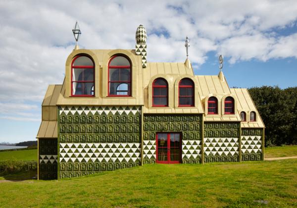 Недавно среди живописных холмов Эссекса возник диковинный “пряничный домик” с облицовкой из цветной майолики, золотой крышей и водруженной на нее серебристой женской фигуркой.