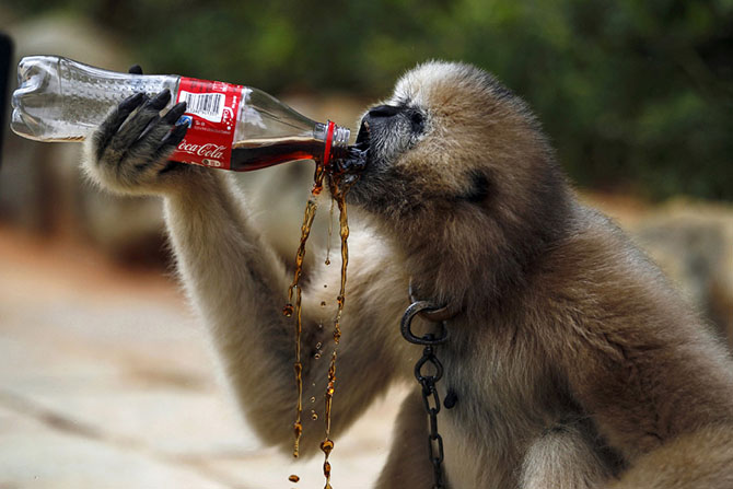 Вредные напитки. Гиббон с удовольствием пробует содержимое оставленной туристами бутылки в зоопарке в провинции Юньнань, Китай. (Фото Wong Campion | Reuters)